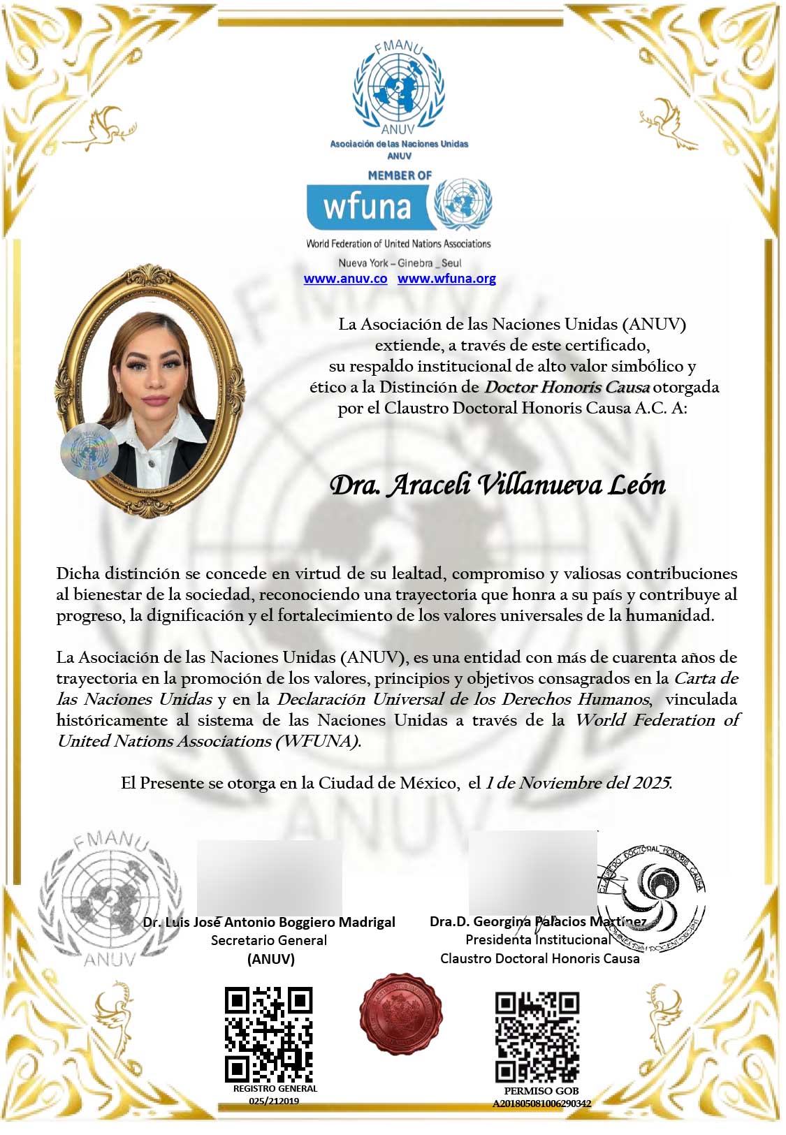 El Claustro Doctoral Honoris Causa A.C. ha extendido a la Dra. Araceli Villanueva León una invitación formal para iniciar el proceso de revalidación oficial de su Título Honorífico, recientemente avalado por la Asociación de las Naciones Unidas (ANUV).