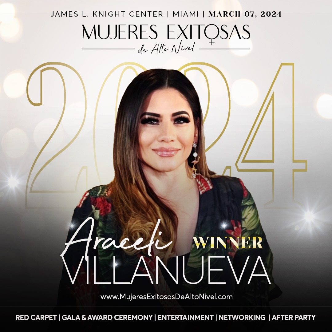 Es un gran placer presentarles a una de las destacadas ganadoras del Reconocimiento “Mujeres Exitosas de Alto Nivel”,Araceli Villanueva. Todos seremos testigos de su entrega el 07 de Marzo en las majestuosas instalaciones del James L Knight Center a las 06:30 pm. Estaremos acompañados de embajadoras, figuras públicas, invitados especiales, alfombra roja, espectáculos musicales, oportunidades de networking y un “after party”. ¡Todas estas sorpresas y muchas más para celebrar el liderazgo femenino!