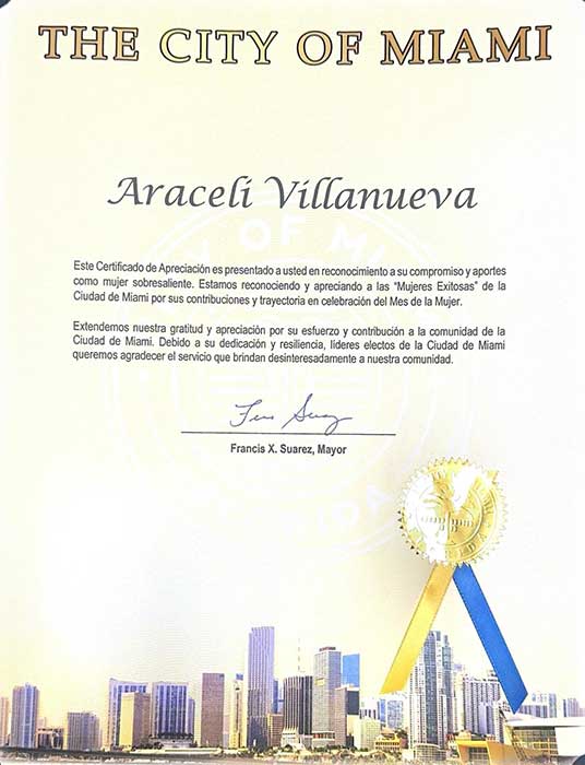 ARACELI VILLANUEVA PA is among a very small group of companies that have won the Miami Award for two consecutive years.