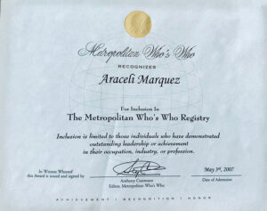 Araceli has also been recognized by Cambridge Who’s Who since 2007 (Empowering Executives, Professionals and Entrepreneurs Around the World).