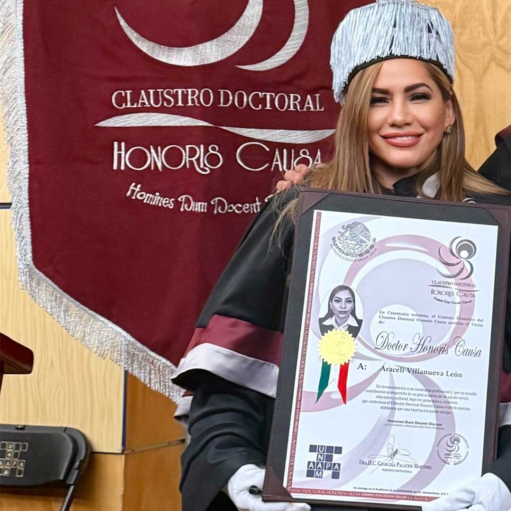 La Dra. Araceli Villanueva León ha sido distinguida con el Doctorado Honoris Causa, otorgado por el Claustro Doctoral Honoris Causa A.C. y respaldado por la Asociación de las Naciones Unidas (ANUV), miembro de la WFUNA.